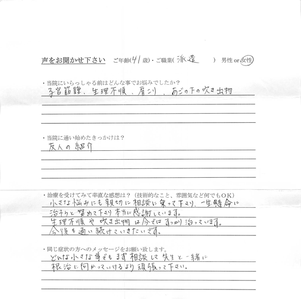小さな悩みにも親切に相談に乗って下さり、一生懸命治そうと努めて下さり本当に感謝しています。