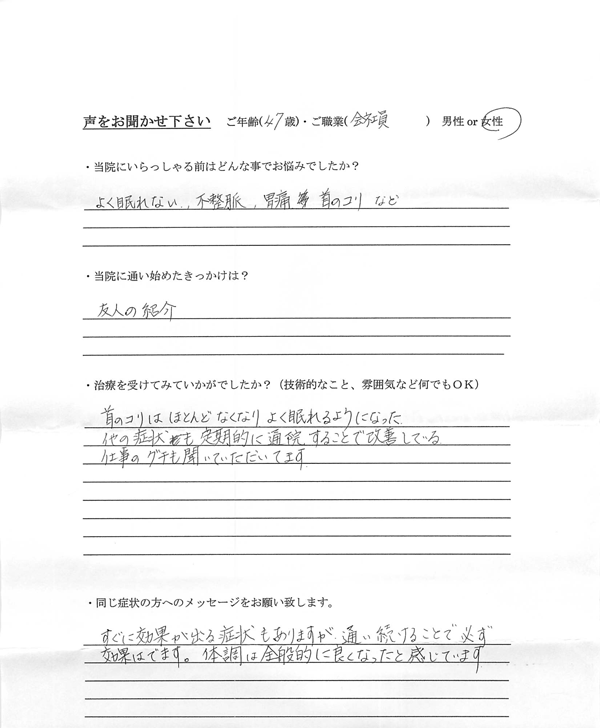 よく眠れない・不整脈・胃痛・首のコリ
