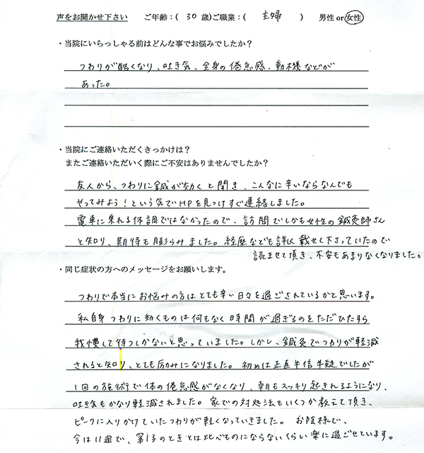 友人から、つわりに鍼が効くと聞き、こんなに辛いならなんでもやってみよう!という気 でHPを見つけすぐ連絡しました。 電車に乗れる体調ではなかったので、訪問でしかも女性の鍼灸師さんと知り、期待も膨ら みました。経歴なども詳しく載せて下さっていたので読ませて頂き、不安もあまりなくな りました。